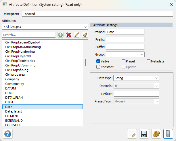 This option gives you a preset value for the attribute that can of course be edited afterwards. Choose between Point ID, X-coordinate, Y-coordinate, Z-coordinate, Point code, Username, Today's date, Today's date and time, Prism constant, Prism height or Instrument.