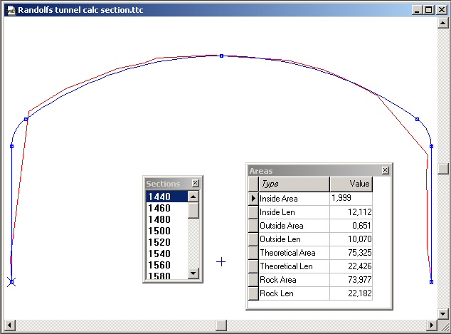 The sections are created. The sections can be edited by selecting Tunnel|Edit point. Points can be added using Tunnel|Add point and deleted using Tunnel|Delete point. The volumes and areas are automatically recalculated when the tunnel cross section is edited.