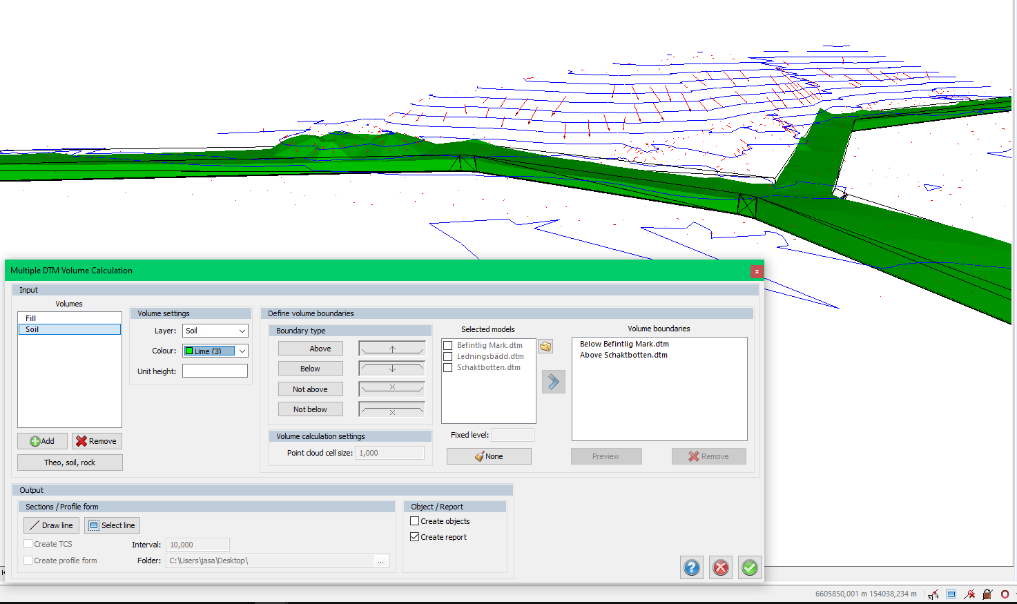 The result can be shown in calculated sections documents, 3D- terrain models with volumes, and reports.