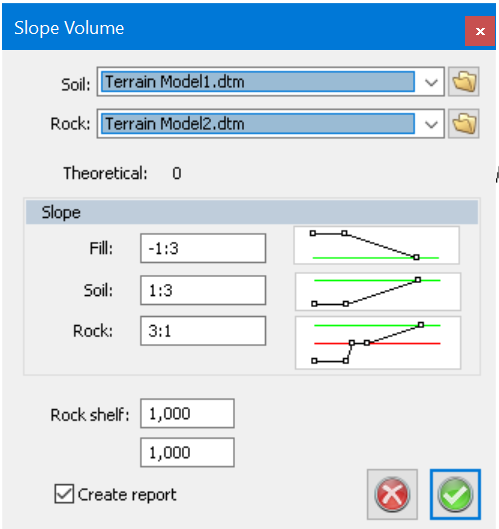 The function is used for volume calculation between theoretical and terrain models. The slope can be set for Fill, Soil and Rock, and also for the width of the Rock. It is also possible to set the width of the rock shelf.