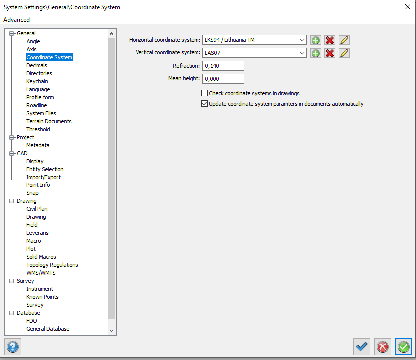 Settings for the coordinate system to be used in this project. Refraction and mean height.