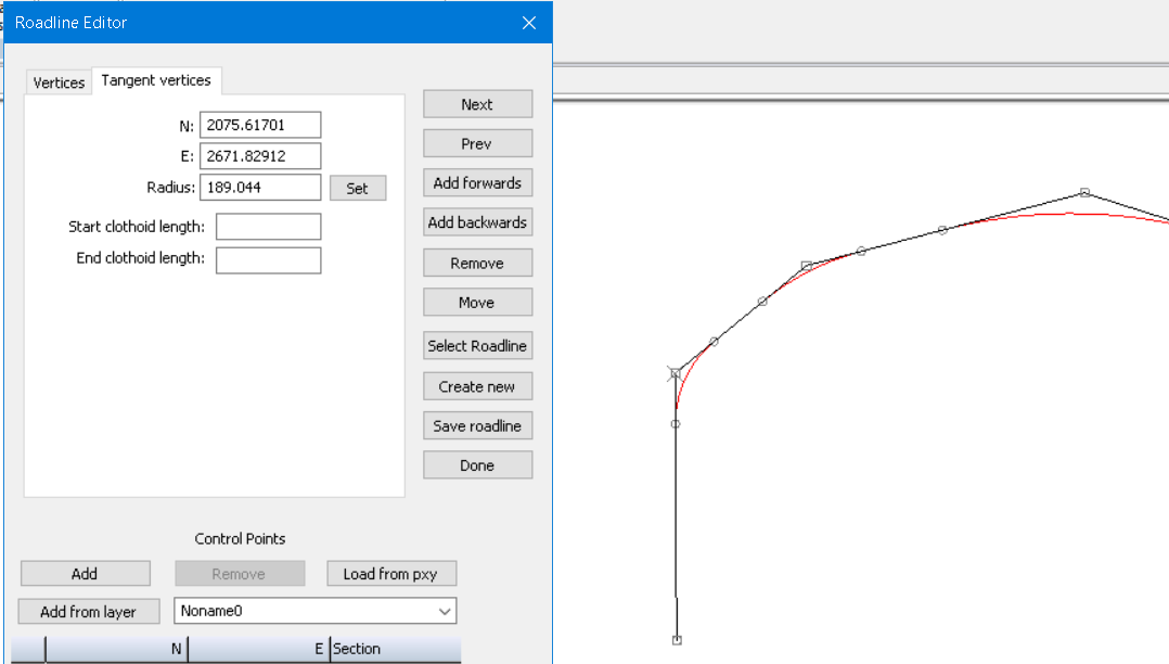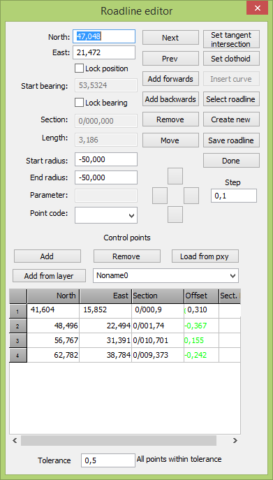- The buttons Next and Previous are used to select next and previous point in the roadline. Add forwards and Add backwards are used to create a new point before and after selected point.