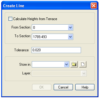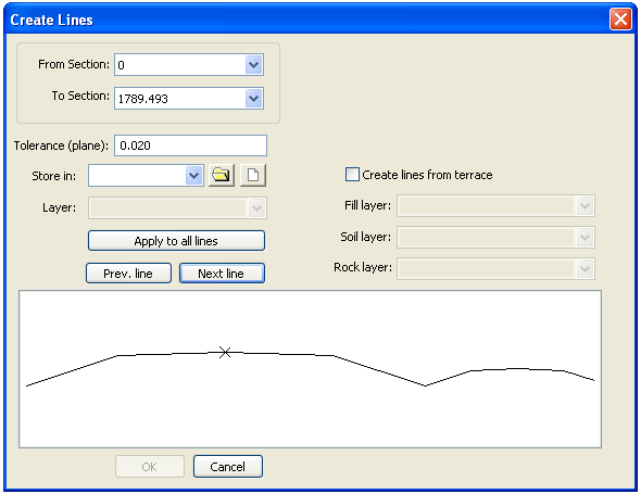 From Create | Create line in drawing and Create | Create multiple lines in drawing you are able to set a tolerance. The tolerance decides how much the created lines can differ from a perfect line. A perfect line is in this case a line which is calculated with an infinite small interval. For example, if the tolerance is set to 0.02, no part of the created line can be created longer than 2 centimetre from the perfect line. The tolerance only refers to deviations in plane. The heights for the point in the created line are interpolated between the calculated sections. The tolerance is not used when lines are created from the terrace.