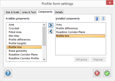 Select between the components in Available components. Components belonging to the same group is placed next to another in profile form and have the same heading.