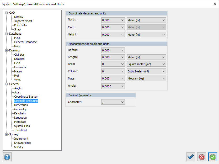 This is where you select the number of decimal places for co-ordinates, heights, lengths and angles. It is also possible to select which character you want to use as the decimal separator.