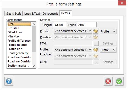 Two profiles must be selected to calculate the area. In this case the profile can be either a profile (*.trp) or a Terrain profile created from a roadline (*.trl) together with a terrain model (*.dtm). Each intersection between the profiles is presented in the form with a vertical line together with its section. The area between two intersections is written between the two intersections. If the first profile is positioned above the second, the area gets a positive value, otherwise a negative. The sums of all the positive and negative areas are presented to the left in the profile form.