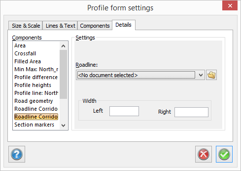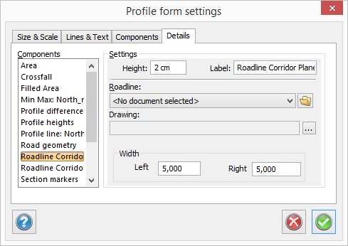 Alignments plotted as a line with the surrounding heights and items reported. Surveyed object beside roadline, as a corridor around the alignments, shown in profile form.