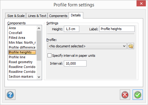 The profile height can be displayed and calculated at any interval along the roadline. This interval can actually be specified as the actual value in meters or in any other paper units.