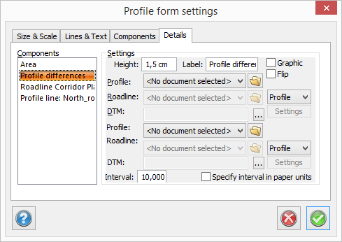 The road profile is displayed in the profile form by adding it on the Components tab. On the Details tab, click on Road profile and select the desired road profile. Also select the colour and line type for the road profile.