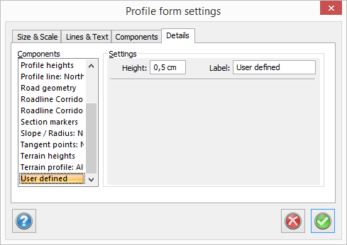 It is possible to enter user defined blocks in the profile form. You can select the height and label for the block. The block is then displayed in the profile form drawing and you can use it to enter any type of data.