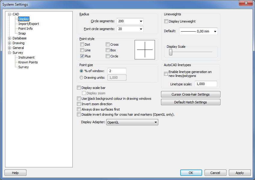 You can select how you want points to be plotted on the drawing (screen) by clicking in the different boxes. You can choose from point, line, plus, cross, box and circle or a combination of these.