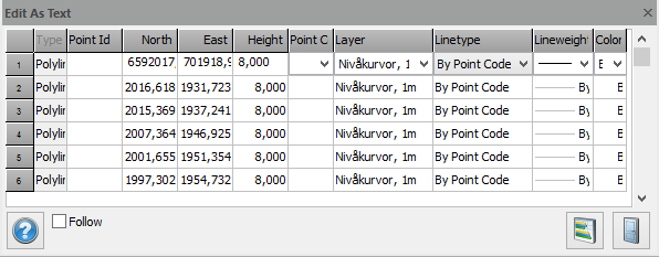 It is possible to view points and points in lines in Edit as text mode. They will be displayed in a grid and all ordinary edit functions for the grid can be used. The Copy command can also be used.