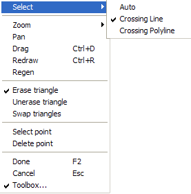 Right click on the terrain model and a pop-up menu will appear for the command. Create or erase triangles with line or polyline by selecting Select|Crossing line and Select|Crossing Polyline.