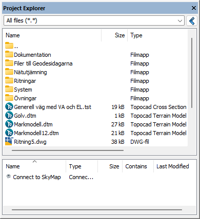 The Explorer gives you an overview of files in your active project. You can easily drag the files into Topocad using "drag and drop" into the CAD window.