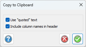 When you select Copy selected rows, for example, you will see a box where you can make choices about Use "stringed" text and Include column headers in the file header. Use stringed text refers to a way of handling text where spaces within a column are considered part of the text string and not as a delimiter between different columns or fields. By enabling "Stringed text," you ensure that the entire content of a column, including any spaces, is copied correctly as a unit.