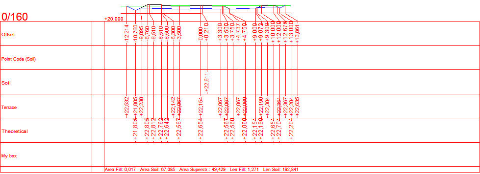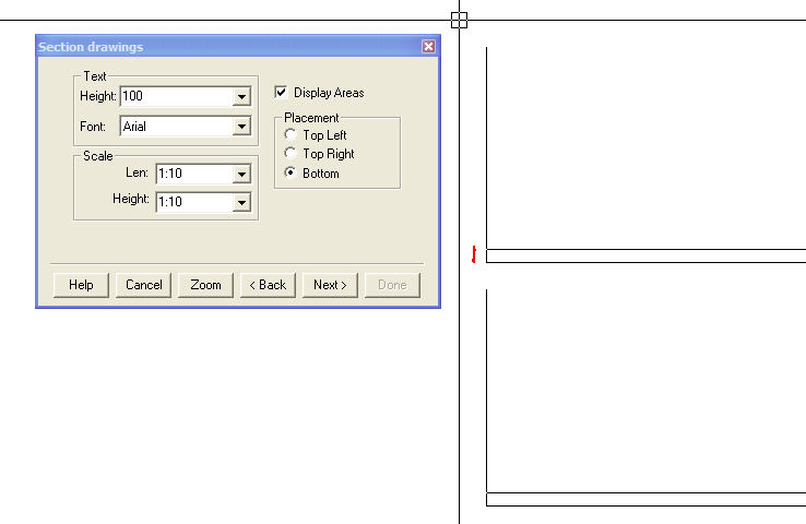 Select the text height and font. It will sometimes be difficult to identify the correct size. Try clicking once in the drawing to obtain an idea of the size. If you have selected "Display areas" and "Bottom" as shown, you will see in the drawing how high the bottom line is. This is shown by the red dot in the screenshot below.