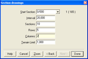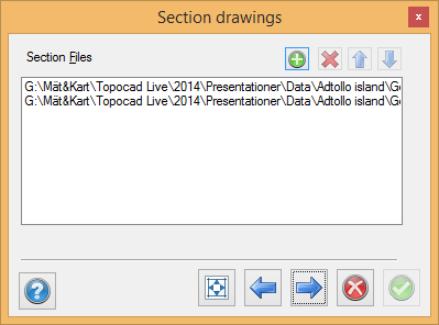 In this dialogue box, you select the section files you want to place in the drawing. You can use one or more created sections at the same time, but they will use the same section. If they are created along the same road line this is fine but if not they will show two different sections for the same section in the drawing. Use the up and down arrows to select the order. If you intend to insert two or more cross section files at the same time, they will need to have the same created section and section interval.