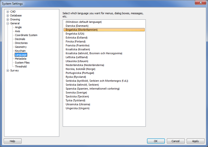 The language is set by default based on your settings in Windows. You can change the language here. You will need to restart Topocad after changing this setting for it to take effect.