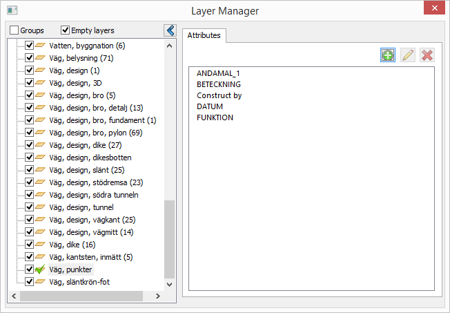 The Layer Manager is one of several ways to separate different types of data in Topocad. A layer may for example consist of buildings, roads or trees or may also have completely different classifications. The benefits of sorting different types of data in different layers are many. For example is it possible to turn on and off the type with a single command. Also, you can arrange the different codes (wall, middle of the road, curb, etc...) into different layers and you can in your drawing ignite or extinguish everything related to the code about to do. It is possible to select multiple layers simultaneously, for example, mark them as frozen simultaneously.