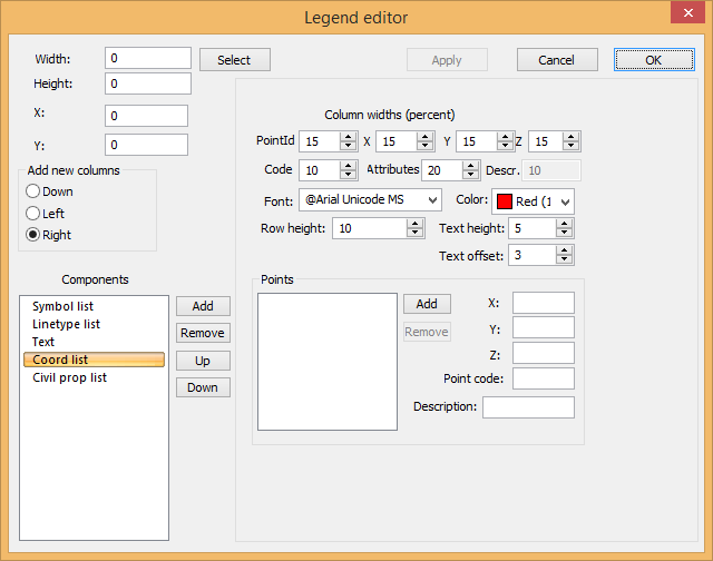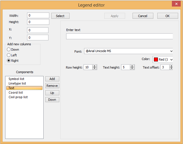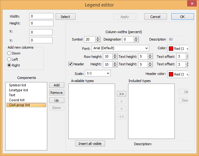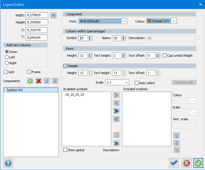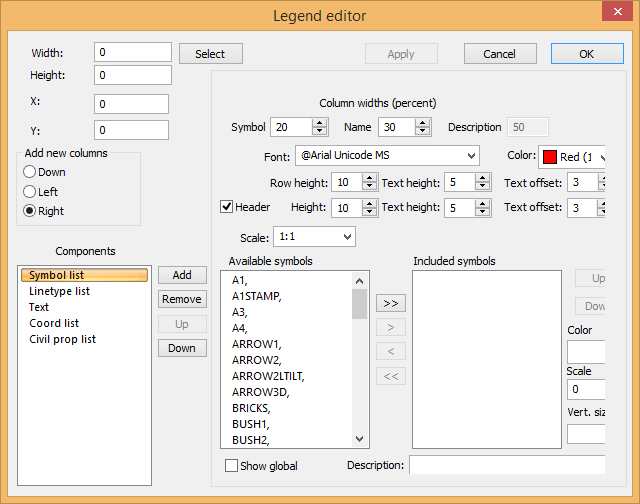 Select the symbols you want to see and add them to the right (Included symbols). In the description field the description for the symbol is displayed but you may edit the text here. Edit column width, font, scale and text height.