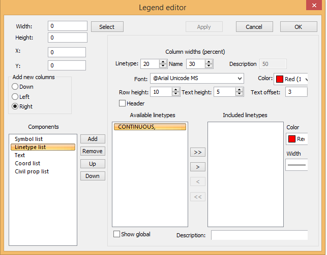 Select the line types you want to see and add them to the right (Included line types). In the description field the description for the line type is displayed but you may edit the text here. Edit column width, font, scale and text height.
