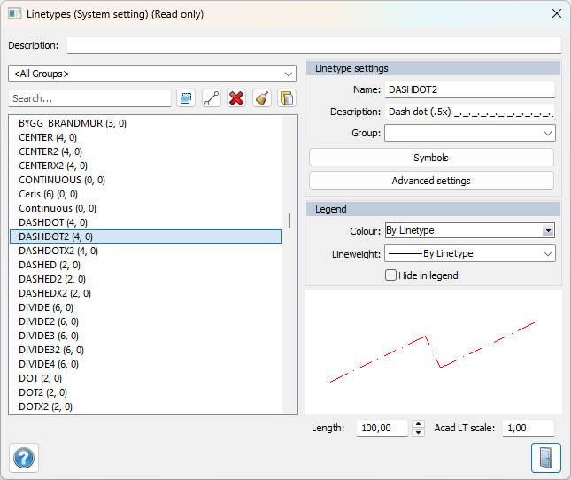 Allows you to delete and rename line types from the table, the global line type is selected under Settings. By opening the table and pointing to the desired line type and then selecting Delete, the line type is removed from the list.