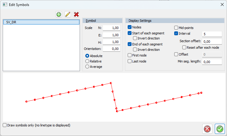 Interval: Determine the distance between symbols, with the option to draw symbols per meter.