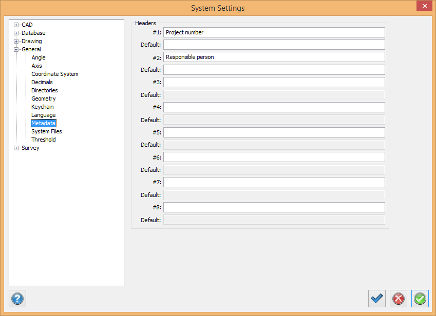 Settings Metadata Home|System settings Add metadata information for your survey data file. See also: Metadata in Survey data window. Copyright © 2025 by Adtollo AB.