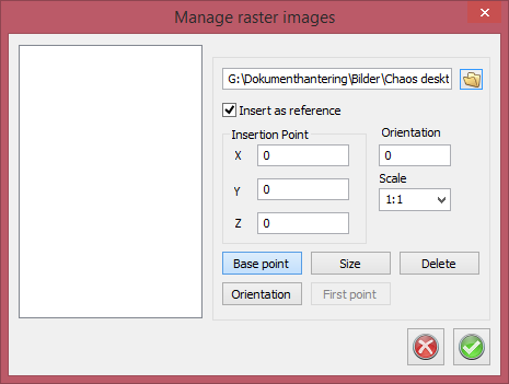 There is a list to the left of the dialogue, listing the raster images inserted in the DTM document. By selecting an image in the list, the position, orientation and scale is entered in the same way when a new image is inserted. It is also possible to delete raster images from the DTM document in this dialogue.