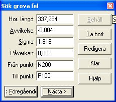 offset in Y which is often 1,500,000 for RT90 coordinates to avoid negative Y values. It is very important to check this value if you allow the net adjustment to calculate the projection correction. If you use coordinates with the specified offset, but forget to specify it as Y offset, a length of 100 m will have an error of around 2.7m. In File|Settings|Project settings|Coordinate you select a system with a specified offset. This is often abbreviated; e.g. RT90 5 GON V 60: -1 means that you subtract 6,000,000 from the X-coordinate and add 100,000 to the Y-coordinate. The projection correction formulas used are described in HMK Geodesi Stommätning Chap. C2.