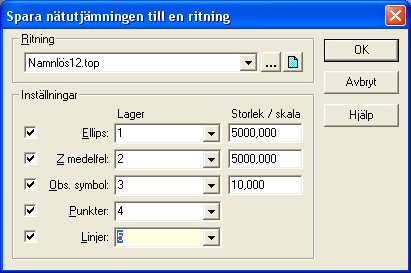 Going to the Net adjustment|Save net adjustment to drawing command saves all detail points and also over-determined points down to an optional drawing. Here you specify the drawing by specifying a previous save, an open or a completely new drawing.