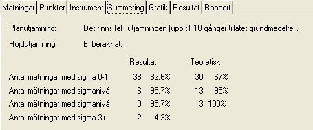 When you have made a calculation you can see the general results by selecting the Summary tab. The calculation primarily specifies if a standard mean error is approved in plane and/or height (see Report). If this is not the case, either the error is specified as large but the calculation was still possible or it was too large to allow an adjustment.