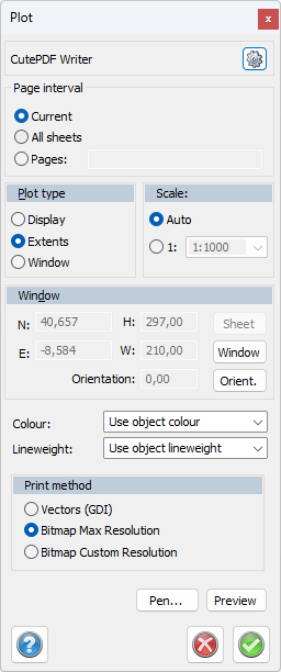 Choose between Use pen map and Use object colour. Pen settings gets the information from project or system settings under Drawing|Default pen map, or from Pen settings (the dialogue below). Object settings takes information from the drawing, in other words the objects colours in the drawing.