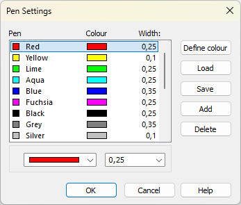 For a better quality printout you should select a pen. Pen settings can be saved and opened/loaded. If you want to use specific pen settings or colours above 18 you will need to define them in Pen settings.