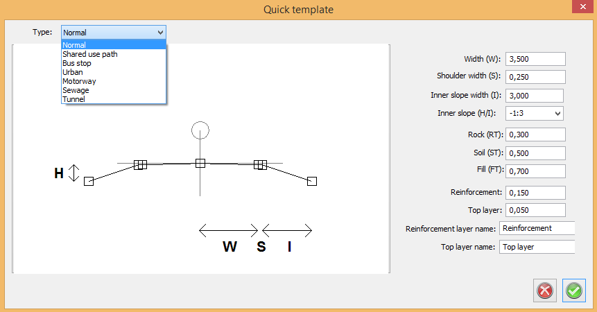 Section templates Quick template Section template|Quick template Function for quick templates for different types of roads. Select between normal, shared use path, bus stop, urban, motorway, sewage or tunnel. Copyright © 2025 by Adtollo AB.