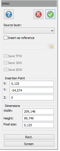 The command inserts an image from a WMS (Web Map Services) as a raster object in the drawing. The command requires at least one layer with WMS settings in the drawing. If the default settings are used, an image will be inserted to current view. It is also possible to select a rectangle from which the image shall be inserted.