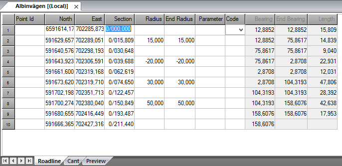 The tab shows current row in road line document marked by a circle in the preview. With possibilities to show all road line nodes.