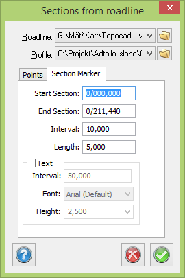 This command calculates sections along the road line. It is also possible to take the heights from a road profile if one has been selected. This feature is only available if you have the Longitudinal section module in Topocad. See Road line for more information about the format of the roadline. You can also create lines for a fixed interval and section information for another interval from the Section Marker tab.