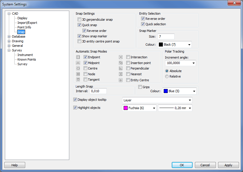 Select if you want markings on the objects in the drawing and which colours they shall have.